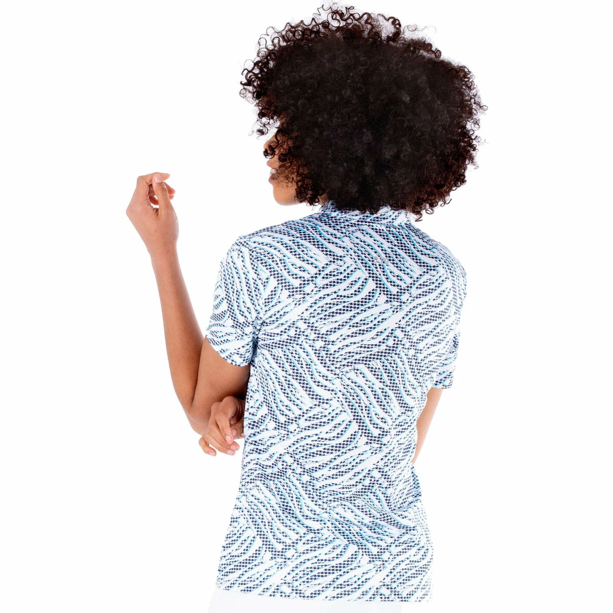 Get feminine styling for the golf course with the NVO Sierra Mock Golf Polo. The Sierra features a mock collar with a zip front that features a graphic print that is flattering and stylish. There is a UPF 30+ rating that keeps you protected from the harmful UV rays of the sun and its also quick drying and moisture wicking to keep you dry and comfortable during your round.
